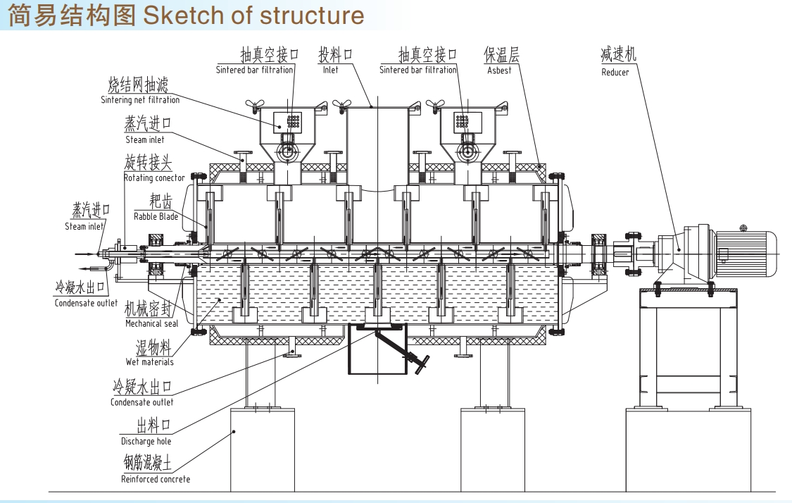 It is an innovation horizontal batch-type vacuum dryer.The moister of wet material will be evaporated by heat transmission. The stirrer with squeegee will remove material on hot surface and move in the container to form cycle flow .The evaporated moisture will be pumped by vacuum pump.