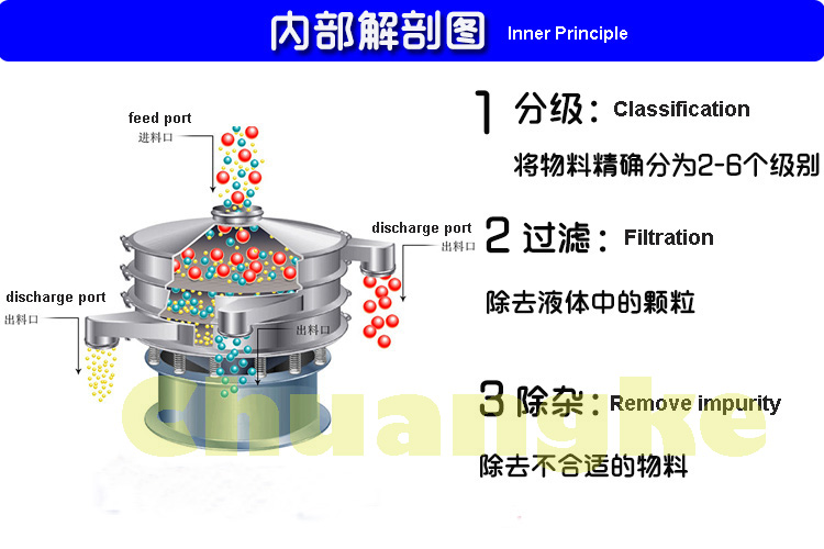 2. High precision screening, high efficiency, any powder, granules, mucus can be used.